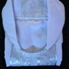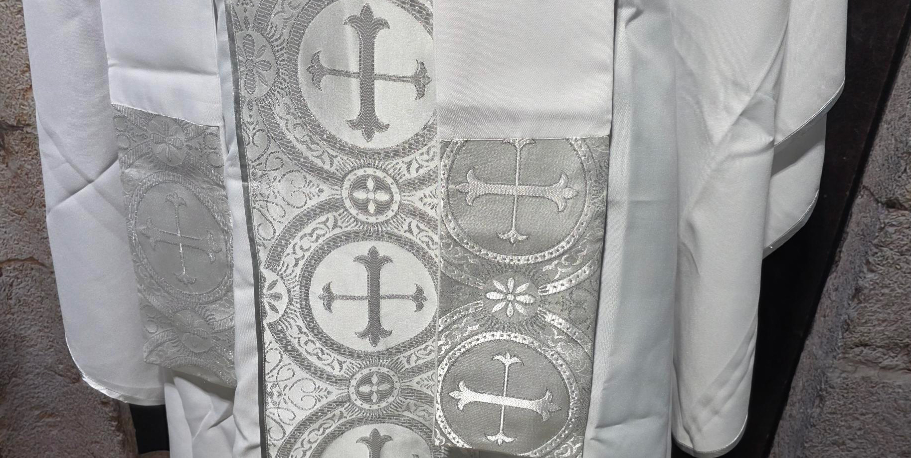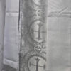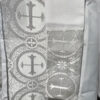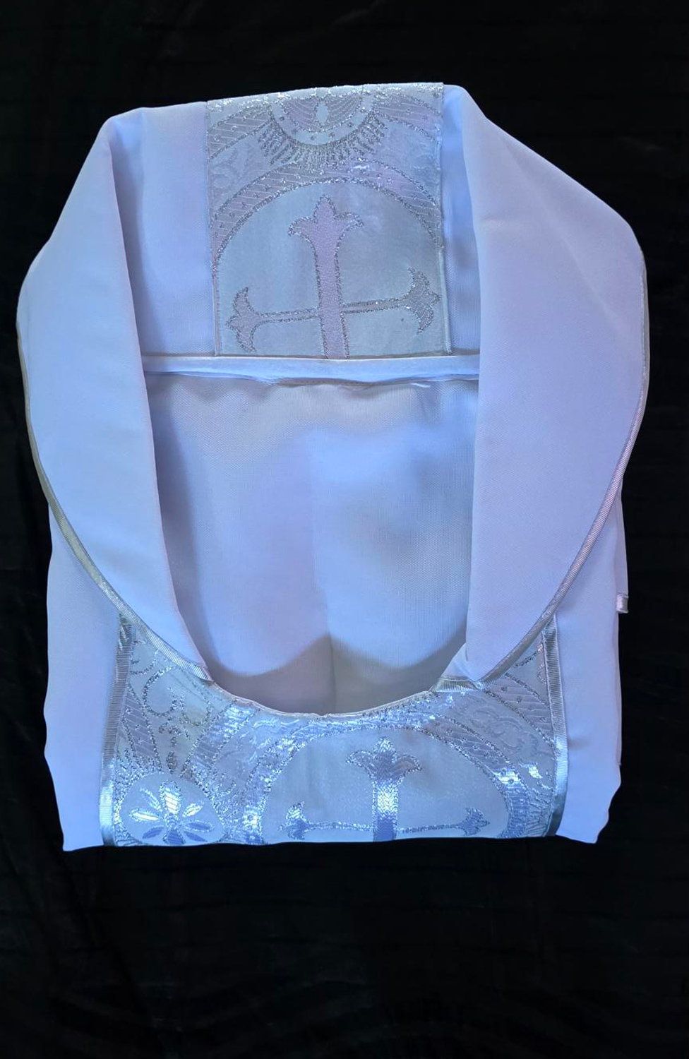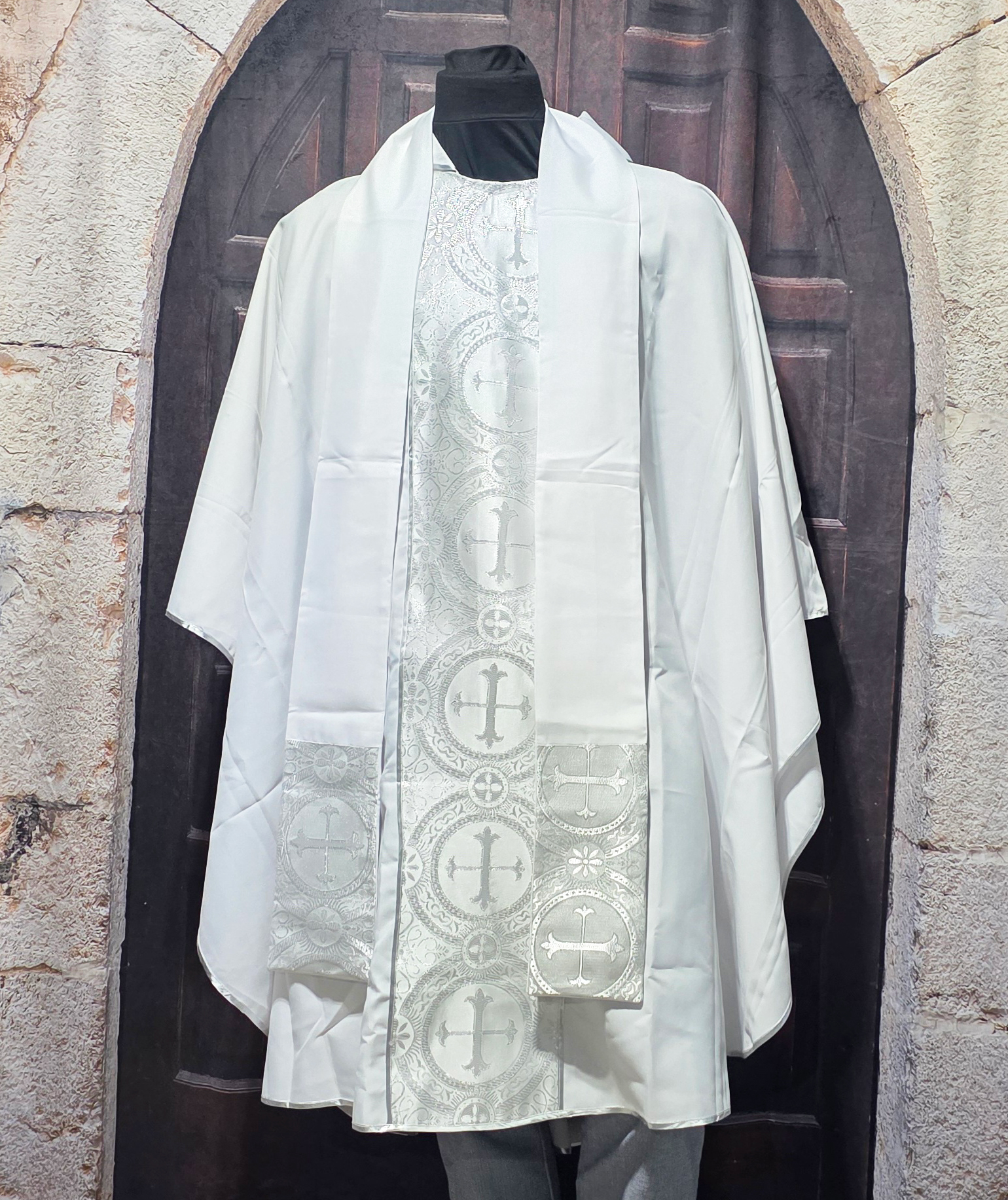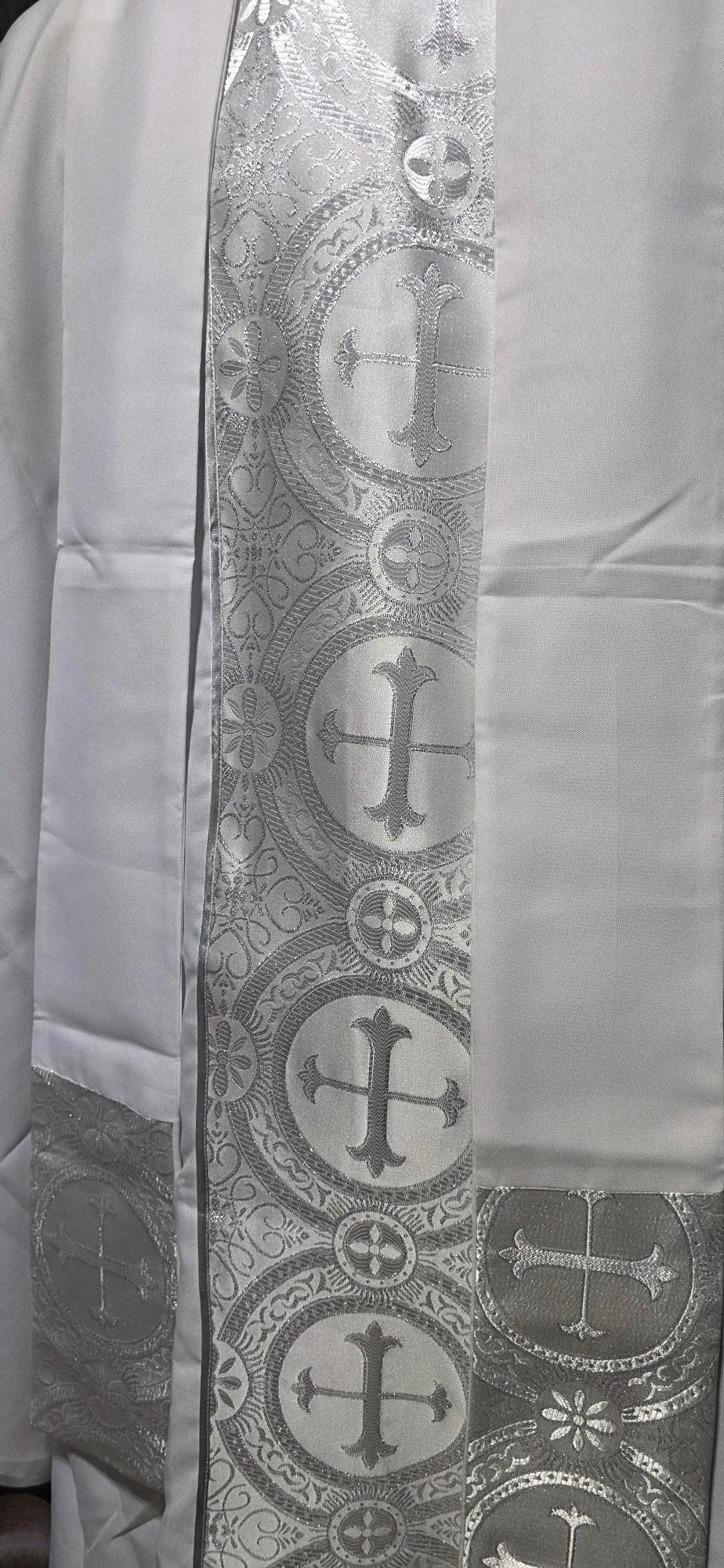 Cowl collar chasuble. Silver luxurious brocade tapestry banding on front and back.